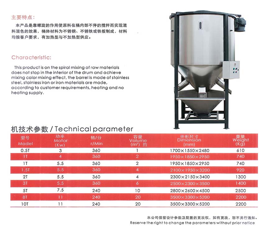 立式搅拌机 在线订购 详细信息 用途:可广泛应用于:塑料片料、粉碎料、塑料颗粒搅拌及存储等用途。 特点: 1:外形立式设计,内部螺杆提升,机械循环搅拌,具有占地面积小、搅拌均匀特点。 2:筒体和盖子使用不锈钢材质,有效的防止水份腐蚀生锈,从而降低因生锈而影响塑料颗粒的质量。 3:螺杆的叶片由激光切割完成,后经液压机模具挤压拉伸,使叶片螺距一致。 上一个:不锈钢混色机 下一个:加热搅拌机 相关产品 塑料搅拌机 不锈钢混色机 加热搅拌机 液压卧式搅拌机