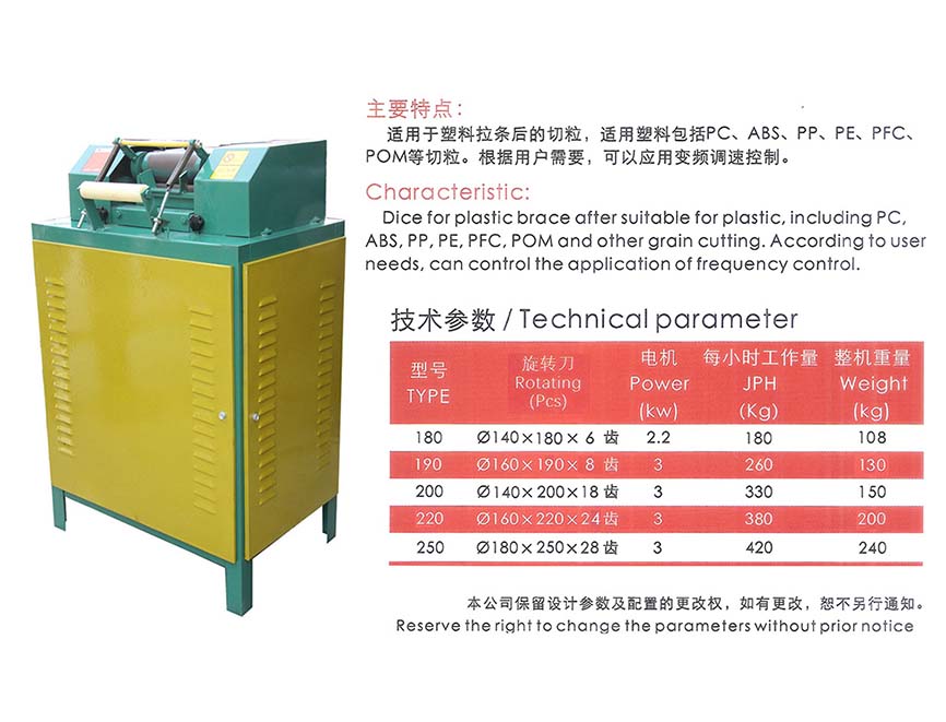 用途:适用于塑料造粒机拉条后的切粒使用,用于PC ABS PP PA PVC POM PPR PBT等塑料切粒。