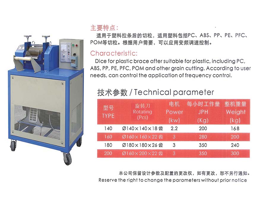 用途:适用于塑料造粒机拉条后的切粒使用,用于PC ABS PP PA PVC POM PPR PBT等塑料切粒。