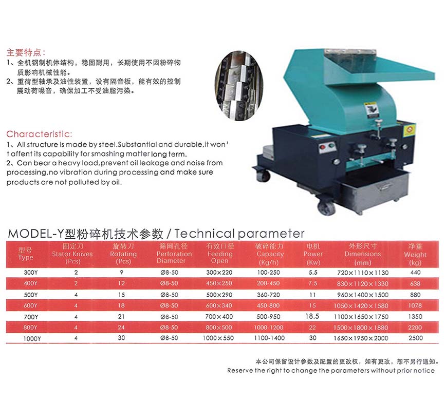 1:粉碎机操作方便,换到简便快捷,平行刀宽大的结构适合破碎大体积薄料产品。