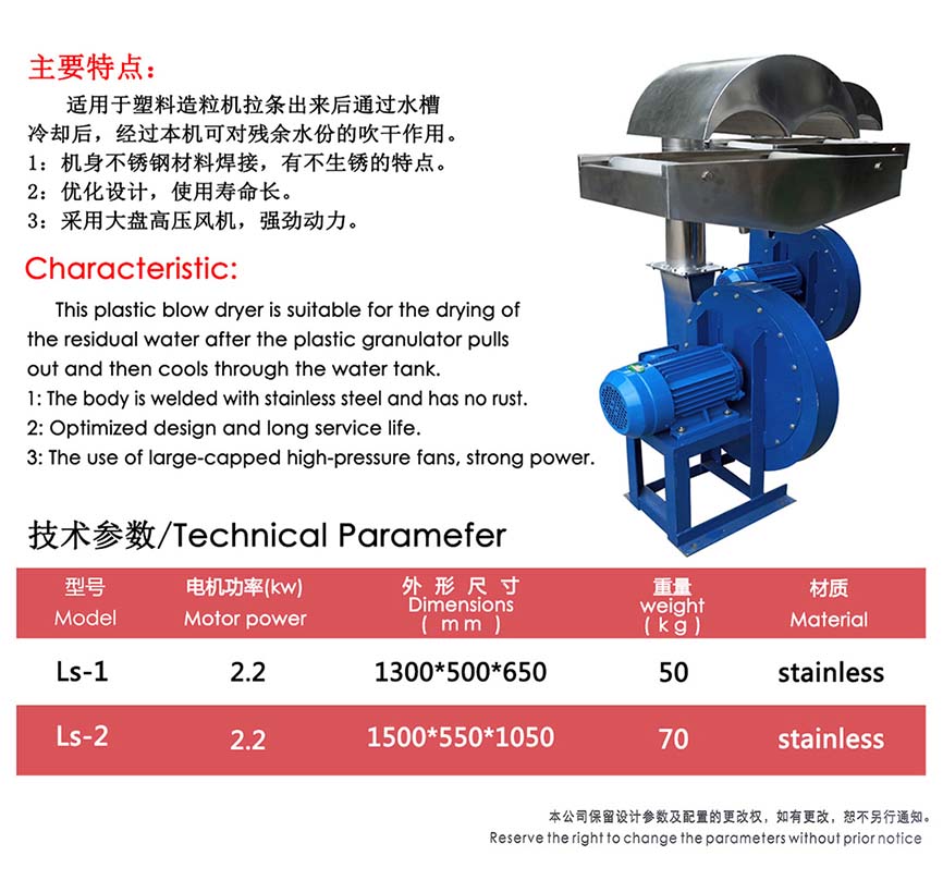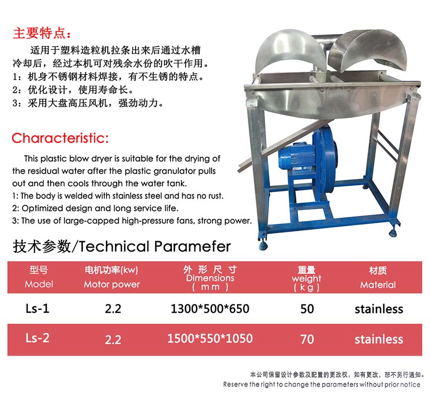 立式风机吹干机 在线订购 详细信息 本塑料吹干机适用于塑料造粒机拉条出来后通过水槽冷却后,经过本机可对残余水份的吹干作用。 1:机身不锈钢材料焊接,有不生锈的特点。 2:优化设计,使用寿命长。 3:采用大盘高压风机,强劲动力。 上一个:自动脱水机 下一个:塑料吹水机 相关产品 立式脱水机 自动脱水机 塑料吹水机 除水抖条机