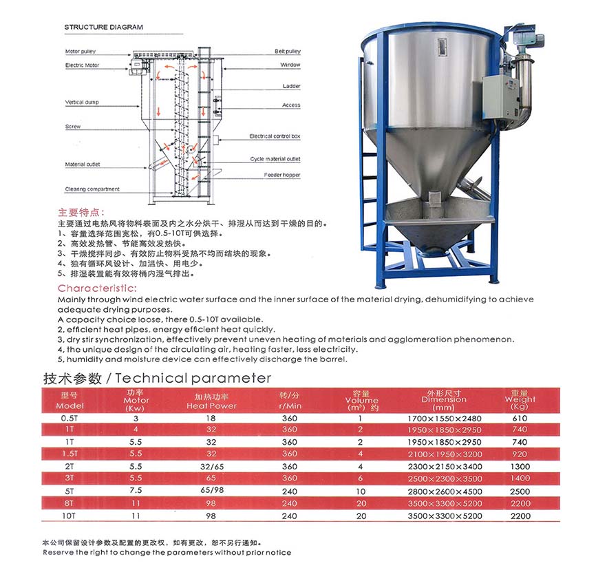 加热搅拌机 在线订购 详细信息 用途:可广泛用于含有水份的塑料片料、粉碎料、塑料颗粒的搅拌烘干存储等用途。 特点: 1:外形立式设计,内部螺杆提升,机械循环搅拌,具有占地面积小、搅拌均匀等特点。 2:筒体和盖子使用不锈钢材质,它可以有效的防止水份腐蚀生锈,从而能有效的降低因生锈而影响塑料颗粒的质量。 3:搅拌干燥同步,物料在进行干燥过程中,持续保持流动状态,热量渗透均运,干燥时间短且不易结块。 上一个:立式搅拌机 下一个:液压卧式搅拌机 相关产品 塑料搅拌机 不锈钢混色机 立式搅拌机 液压卧式搅拌机