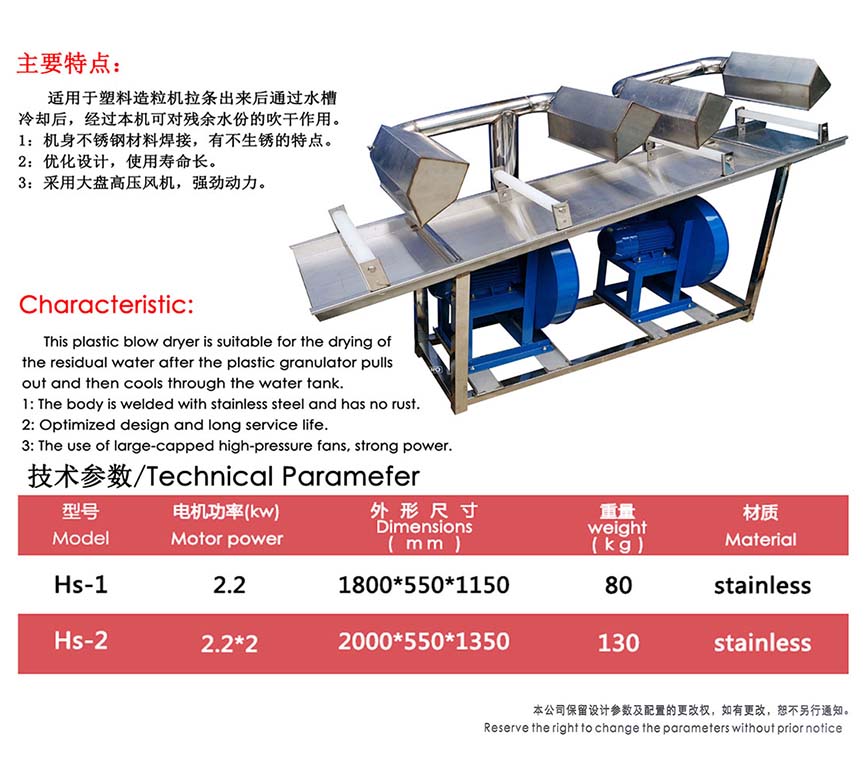 Uses: This plastic blow dryer is suitable for the drying of the residual water after the plastic granulator pulls out and then cools through the water tank.